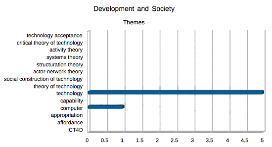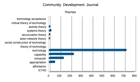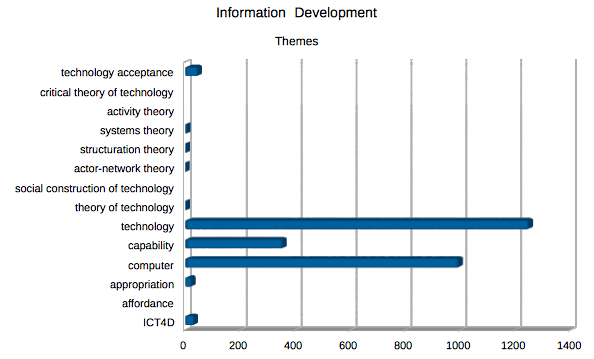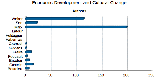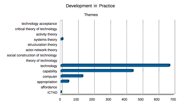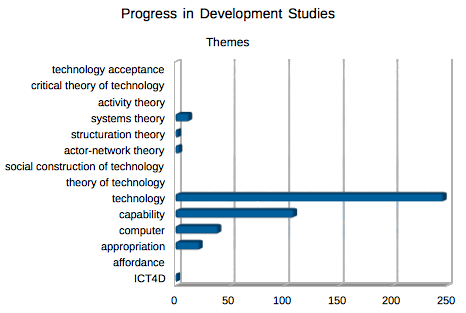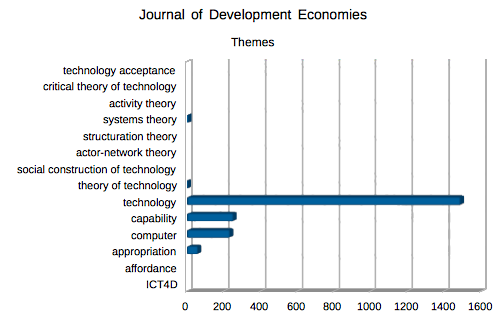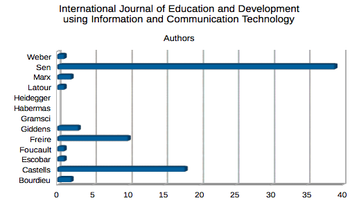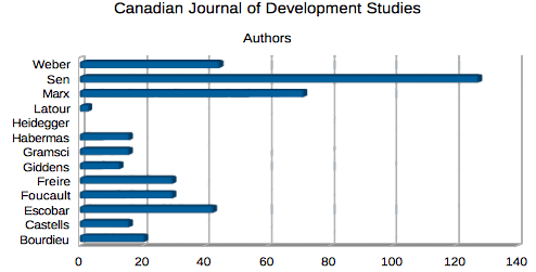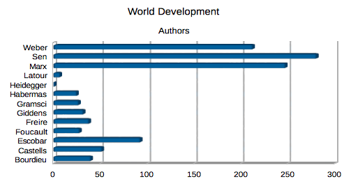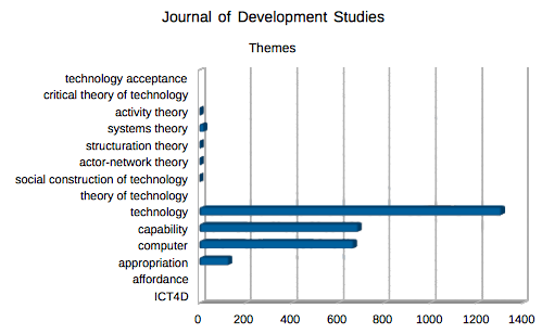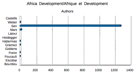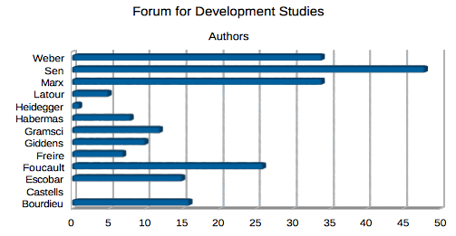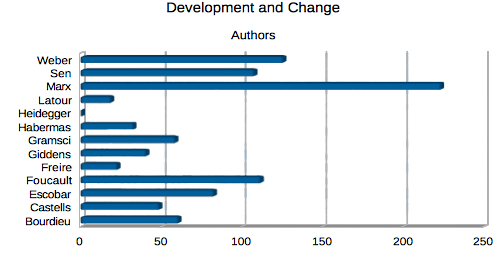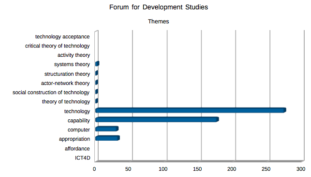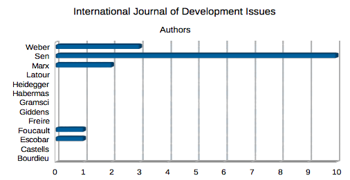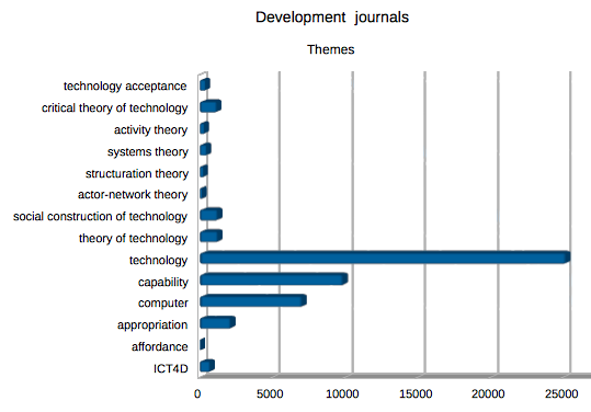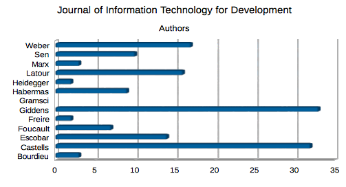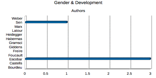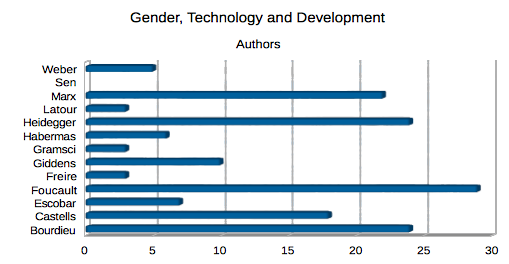 For example, although Gender & Development might be concerned with development, apart from Sen and Escobar, the total absence of any of the more technologically minded authors, suggests that technology is not much considered. Compare this with Gender, Technology and Development, where all the theoreticians typically cited in development journals feature - except, strangely Amartya Sen (but that might be due to poor search results). Although the main focus of both these two journals seems to be gender and development issues one ignores the role of technology.