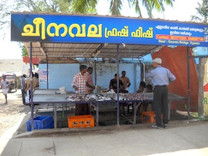 A fish vendor just outside the Sri Gosreepuram Fish Landing. Compare this permanent stall, with advertising board, to the much poorer fish vendors in the south - eg. at Valiathura.