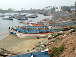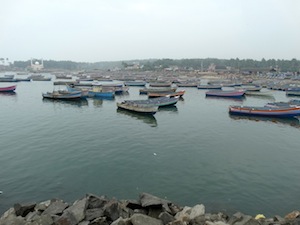 A view to the north of Vizhinjam harbour. Another mosque painted white is visible on the right. This is one of the few safe harbours in the south.