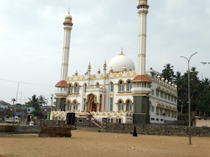 The newer green mosque on the north side of the harbour at Vizhinjam. The much older mosque is visible on the far left.