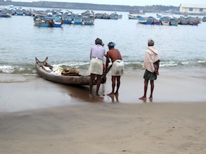 Traditional fishermen beaching their katummaran. The craft is constructed by stringing together two or three tree trunks. They use either nets to harvest fish, or dive for shellfish.