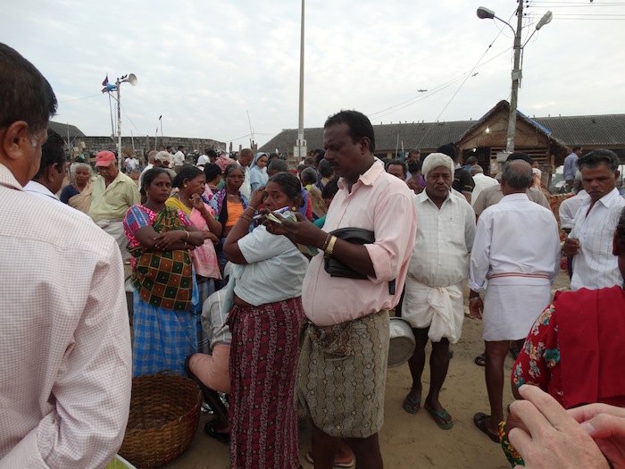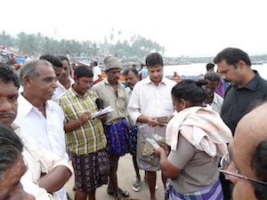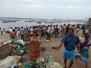 A boat landing at the beach market in Vizhinjam. Auctioning takes place on the beach sand.