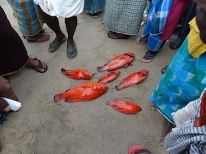 A lot of red snappers being auctioned. The fish were part of a larger catch, which was first auctioned off. This smaller lot was then auctioned off by itself.