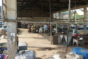 Although there is this roofed construction with concrete floors, it is not used as a market - at least not during the low season when we visited. This construction is closer to the Muslim side of the harbour, which might be another reason why the Christian south does not use it. In 1995 there were riots and some killings between different factions of fishermen. The majority of fishermen are christian, and the Church of St Mary's brokered a deal between the factions.
