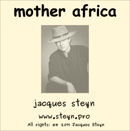 Africa is the birthplace of homo sapiens sapiens. In South Africa there is abundant evidence for this. At the Blombos Cave near Jongensfontein in the western Cape some evidence is dated to between 70'000 and 100'000 years ago. Our distant ancestors who lived there were cognitively well developed. There are abstract geometric patterns on a piece of ochre - something animals such as our distant cousins, the primates, do not do. Africa is our mother. But generally speaking things are desperate on our birth continent. |