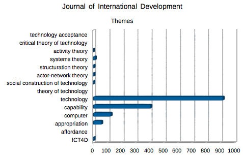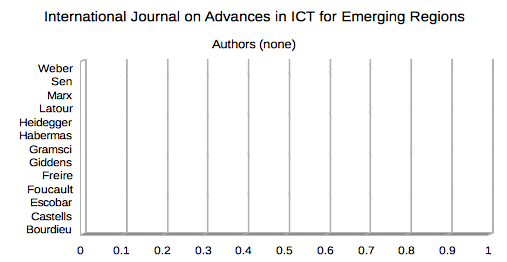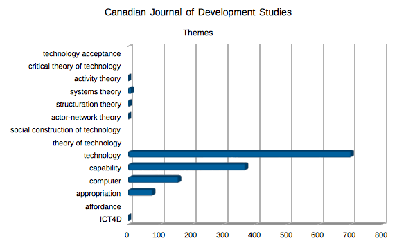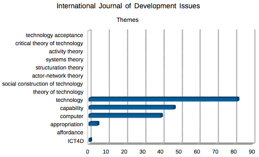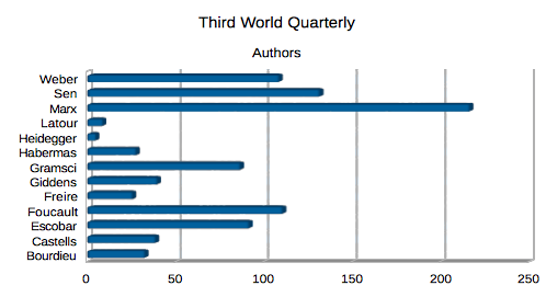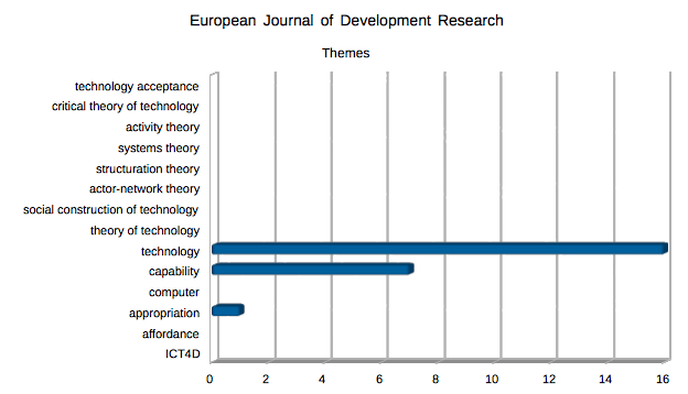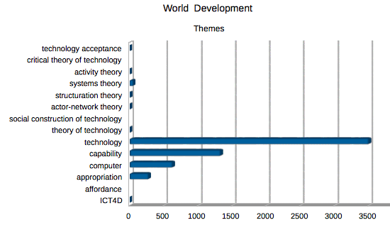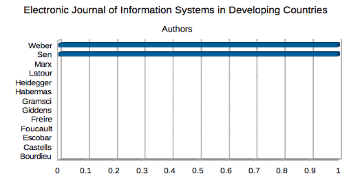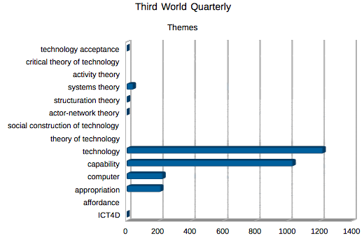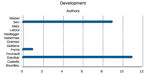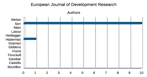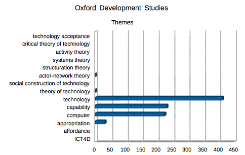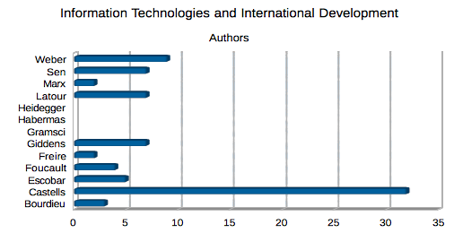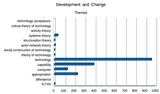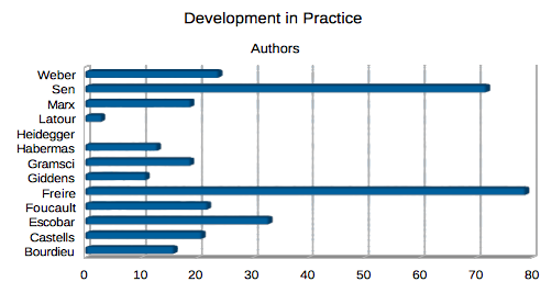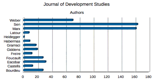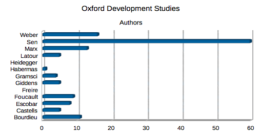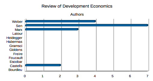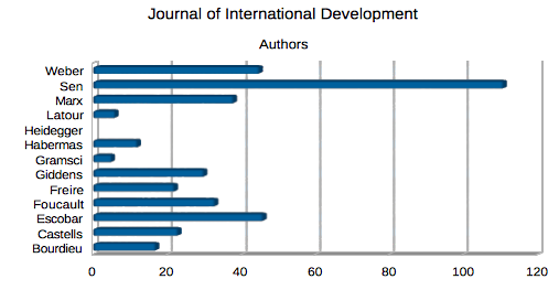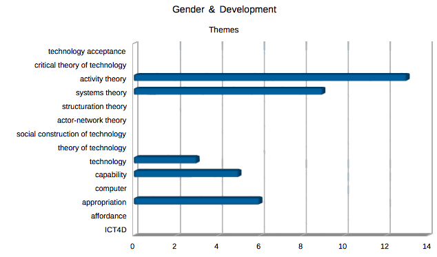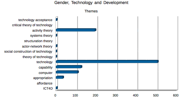 For example, although Gender & Development might be concerned with development, apart from Sen and Escobar, the total absence of any of the more technologically minded authors, suggests that technology is not much considered. Compare this with Gender, Technology and Development, where all the theoreticians typically cited in development journals feature - except, strangely Amartya Sen (but that might be due to poor search results). Although the main focus of both these two journals seems to be gender and development issues one ignores the role of technology.