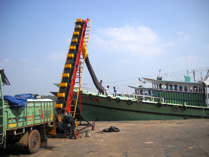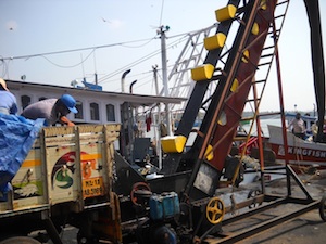 Ice from a truck loaded onto a trawler. This operation is much larger and mechanized than in the south - compare with the ice services at Vizhinjam.