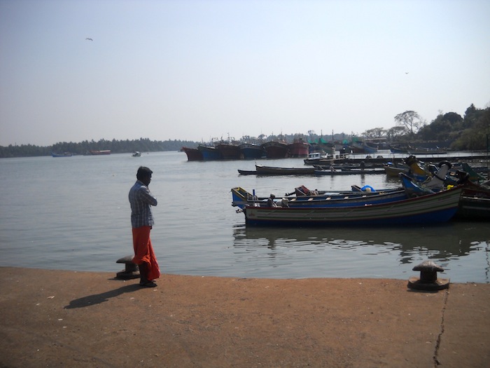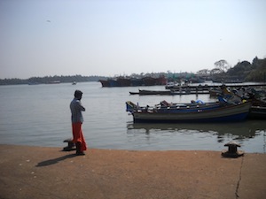 A fisherman on his mobile phone on the pier at Beypore.