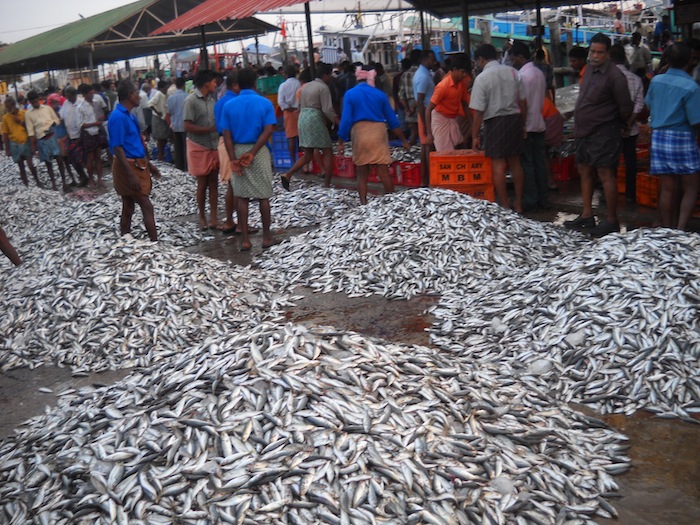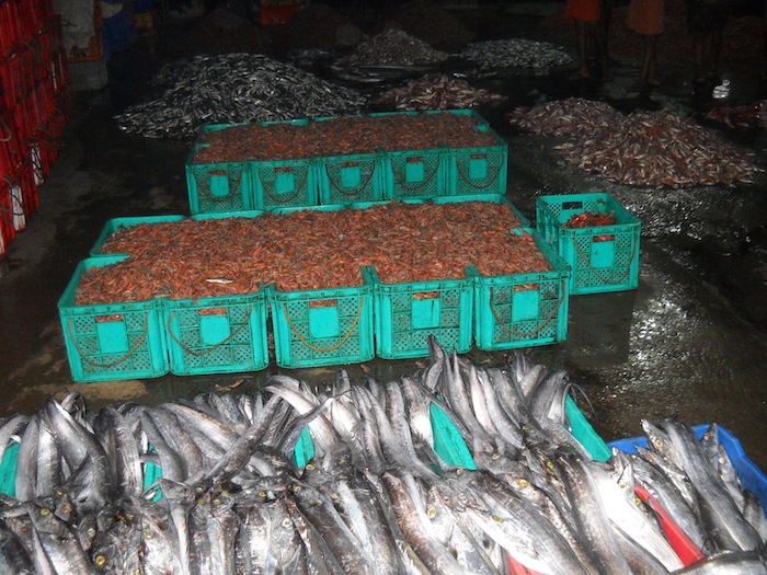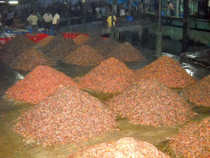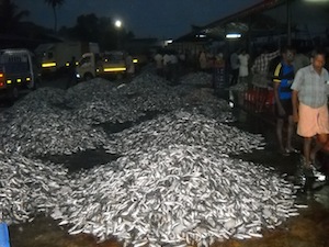 Kalamukku fish landing centre lies north of Gosree Bridge in Kochi. Compare these large catches with the very small catches of the south, such as at Vizhinjam.