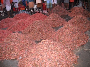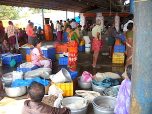 The marketat Kalamukku is under roof, on a concrete floor. Most of the southern markets are held on the beach sand with no roof cover.
