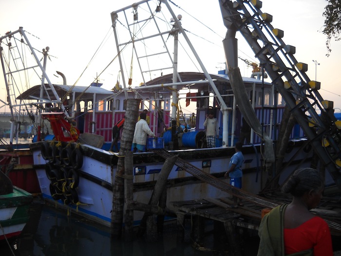 These trawlers are much more sophisticated than the craft used in the south, and mechanized. Compare these with the small, unsophisticated craft such as at Valiathura.