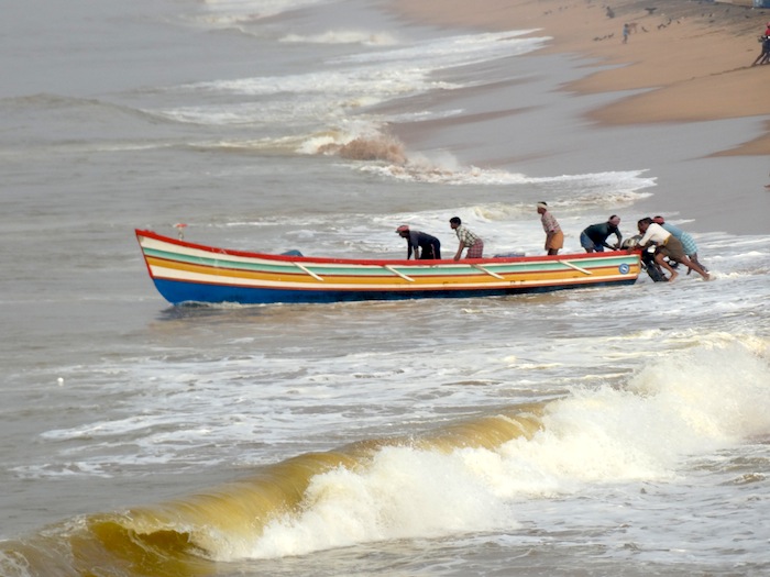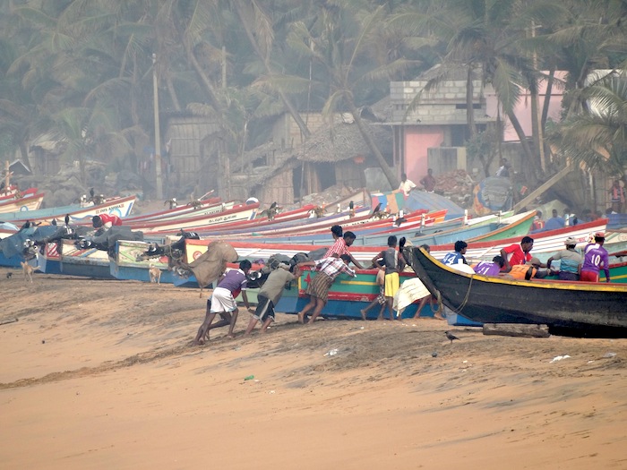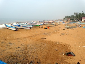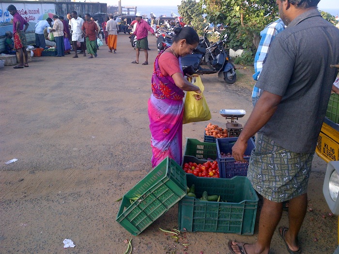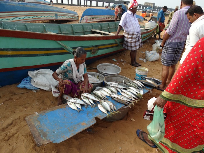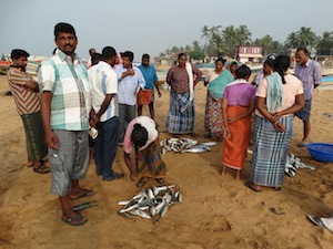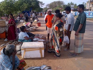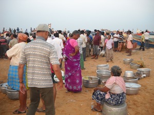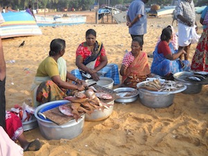 The market at Valiathura is held on the beach sand. These vendors have just bought their fish, and will eventually move closer to traffic in the streets.