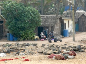 A fisherman's house. Compare this simple dwelling with the more affluent fishermen homes of the north - for example at Chavakkad. Note the outboard engines being repaired.