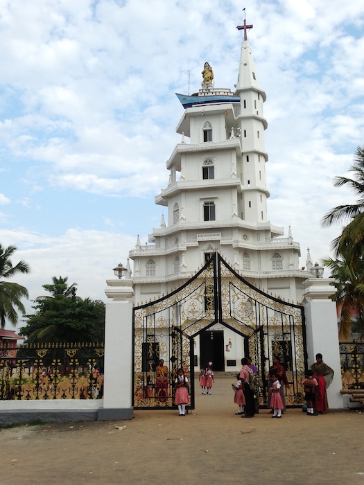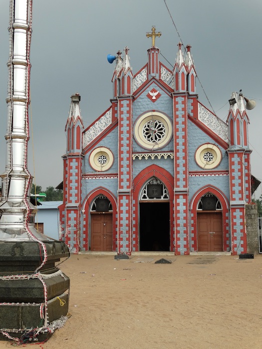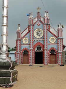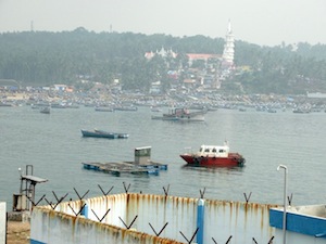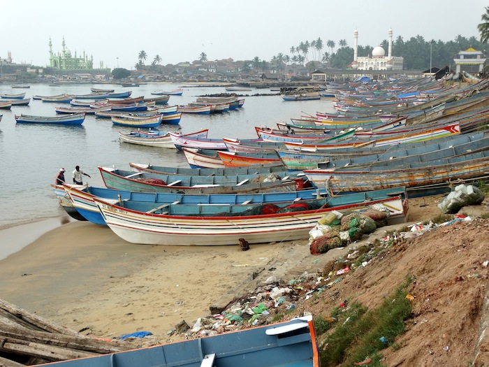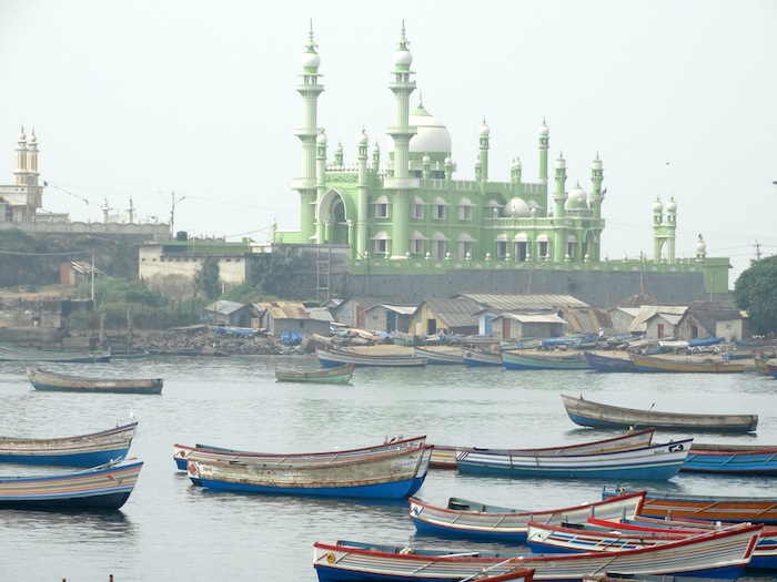 A view to the north of Vizhinjam harbour. Another mosque painted white is visible on the right. This is one of the few safe harbours in the south.