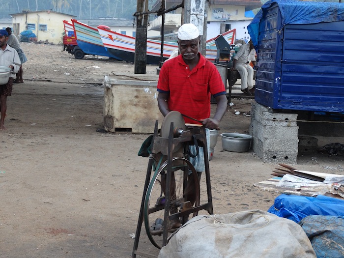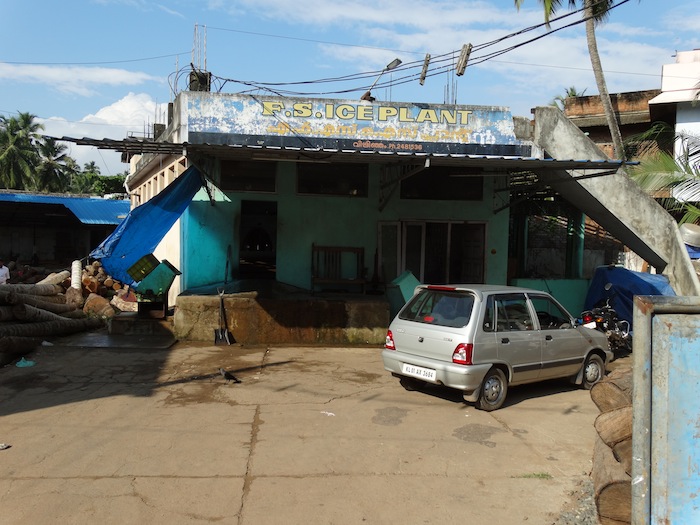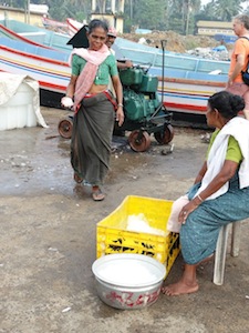 An ice crusher operator sells ice to vendors. Compare this small-scale operation with the large scale ice delivieries to trawlers in the north, such as at Beypore.