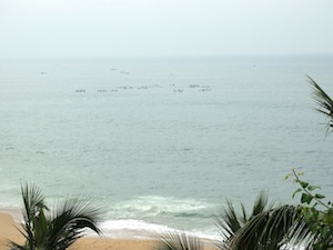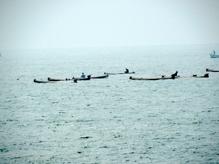 A group of more than 20 traditional kattumarans at Vizhinjam Beach. Fishermen snorkel and catch mainly shellfish.