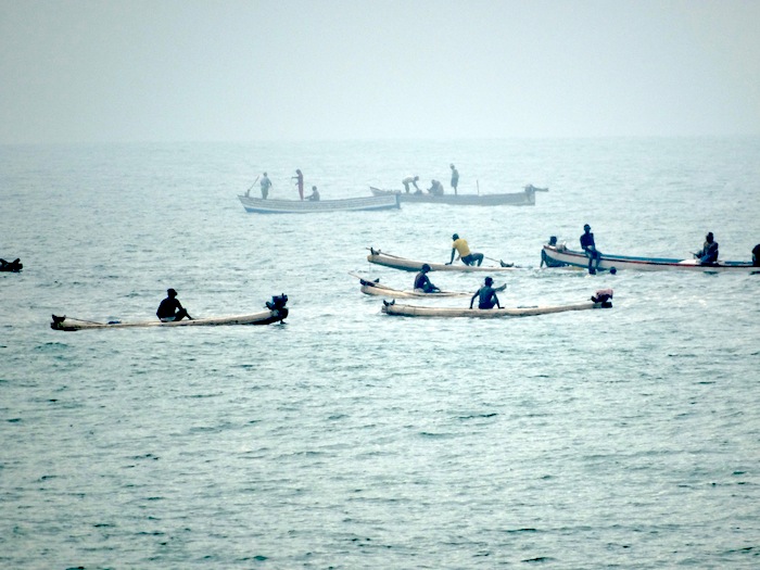 Fishermen in traditional kattumarans dive for shellfish at Vizhinjam Beach, which is south, adjacent to Vizhinjam harbour.