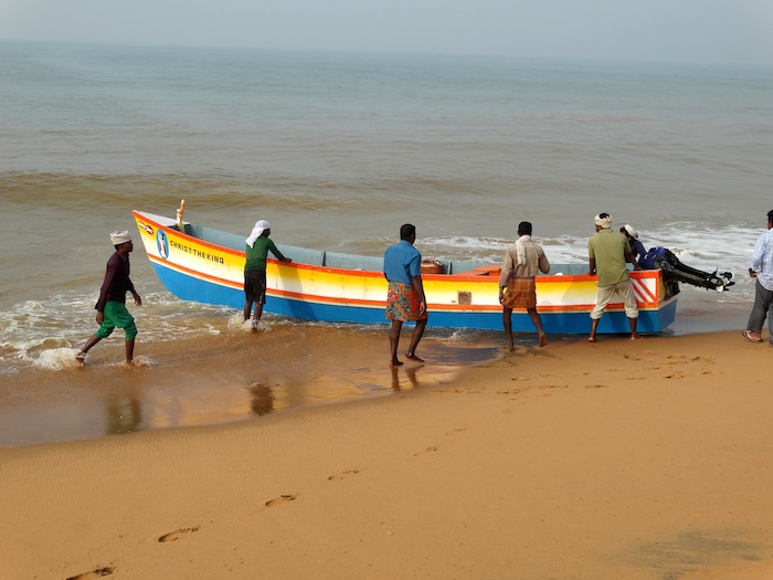 The Kattumaran is the traditional fishing craft, consisting of typically two logs strung together. Some have a long-shaft outboard engine, but most are rowed using a plank -- i.e. not a contoured oar.