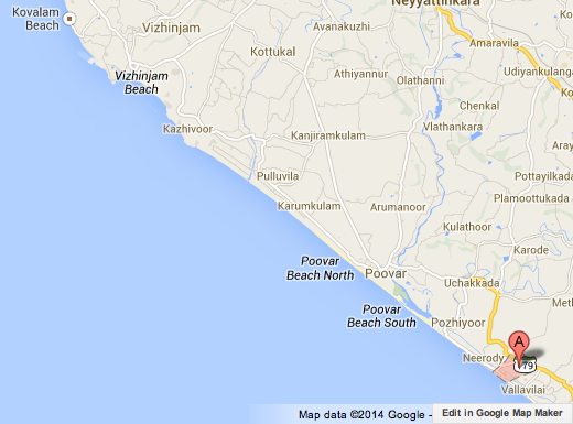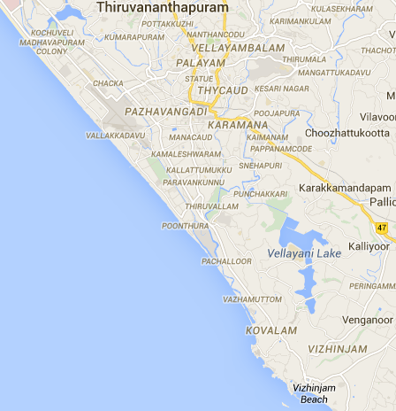 Vizhinjam is a fishing port of Thiruvananthapuram, about 13Km south of the city centre, as the crow flies. It is about 8Km south of Valiathura.
