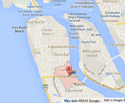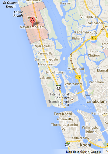 Kochi is the second most populated city in Kerala (after Thiruvananthapuram, or Trivandrum). For our research project we used Kochi as the boundary between the north and south coasts, and included its data in the north coast discussions. We visited several fish landing sites in Kochi. Vypin island can be seen top-left in the map.