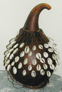 The traditional cabasa consists of a gourd with objects (such as seeds or shells) strung around the main body. These objects serve as shakers. Modern cabasas have a wooden soundbox instead of the gourd, and have metal beads.