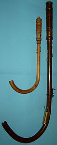 The Crumhorn (from German Krummhoerner, which means bent horn) was most commonly used during the Renaissance period. It is basically a partially bent flute, and has a double reed installed inside the pipe. The instrument as a whole might be regarded as the chanter part of a bagpipe. Fingerholes change the length of the pipe.