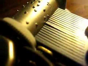 The music box consists of a set of typically small metal bars, structurally similar to those of the xylophone or kalimba. Instead of being hammered or struck as in the case of these instruments, they are "plucked" mechanically by small rods installed on a revolving cylinder. The position of these rods follow the score in a similar fashion as piano rolls.