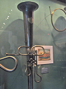 The ophicleide is a keyed bugle, and thus a type of horn. This long pipe is bent back over itself to make the instrument shorter for easier handling. It has nine to twelve keyes to control the opening of the holes, which serve to alter the length of the pipe for different pitches. Its mouthpiece is similar to those of the modern trombone and euphonium. The instrument is flared, and has a large bell.