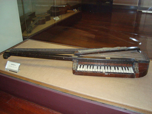 The orphica may be regarded as a small portable piano. It has a keyboard and soundboard, and the instrument is hung around the neck of the musician, or played on the lap. It has a long neck, like the guitar, which functions as structural support for the longer strings.
