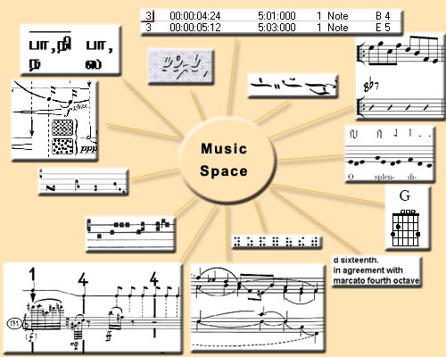 The porposed Music Space is the underlying abstract layer of description onto which elements of Audio Space and of Visual Space are mapped.